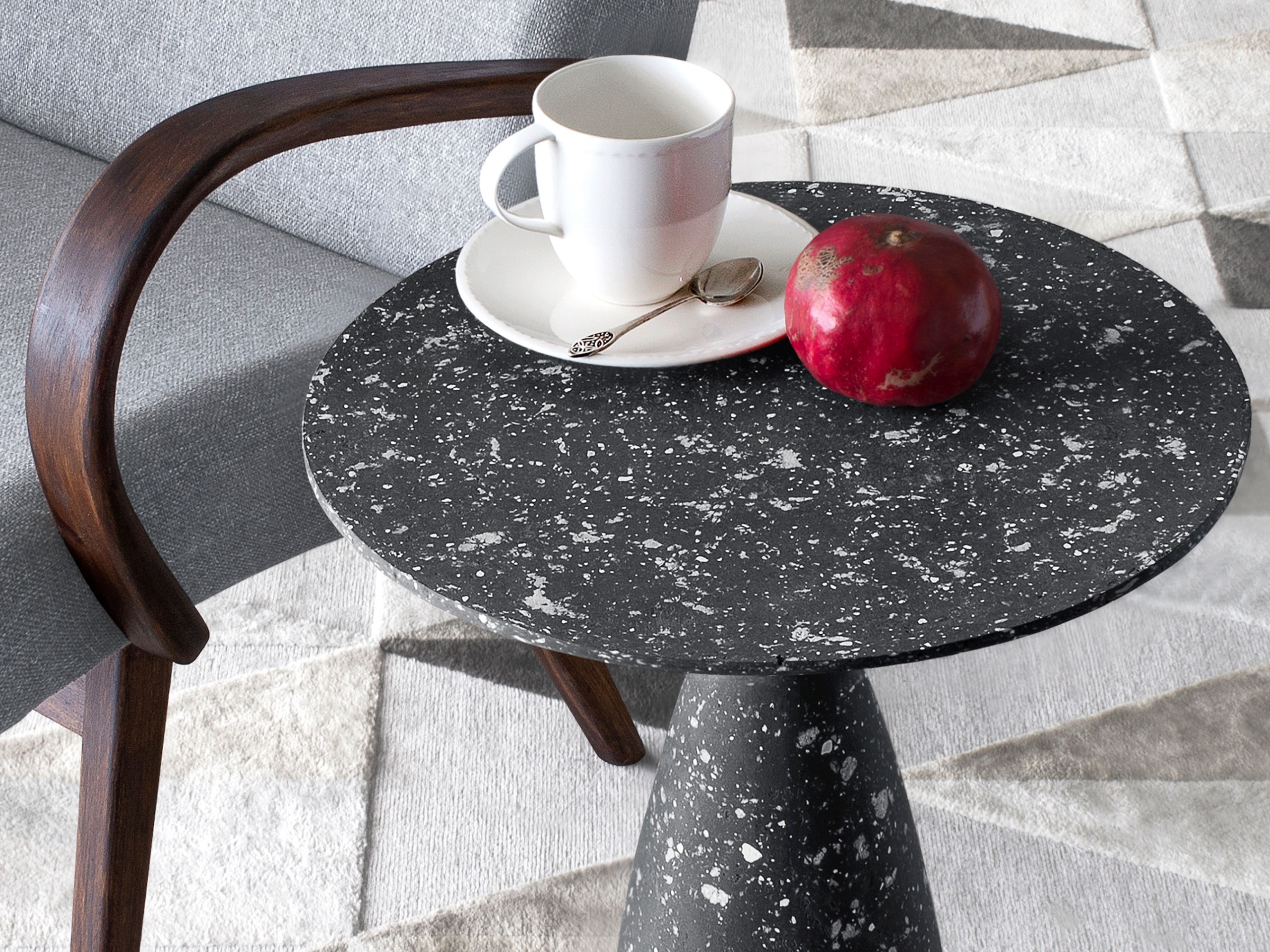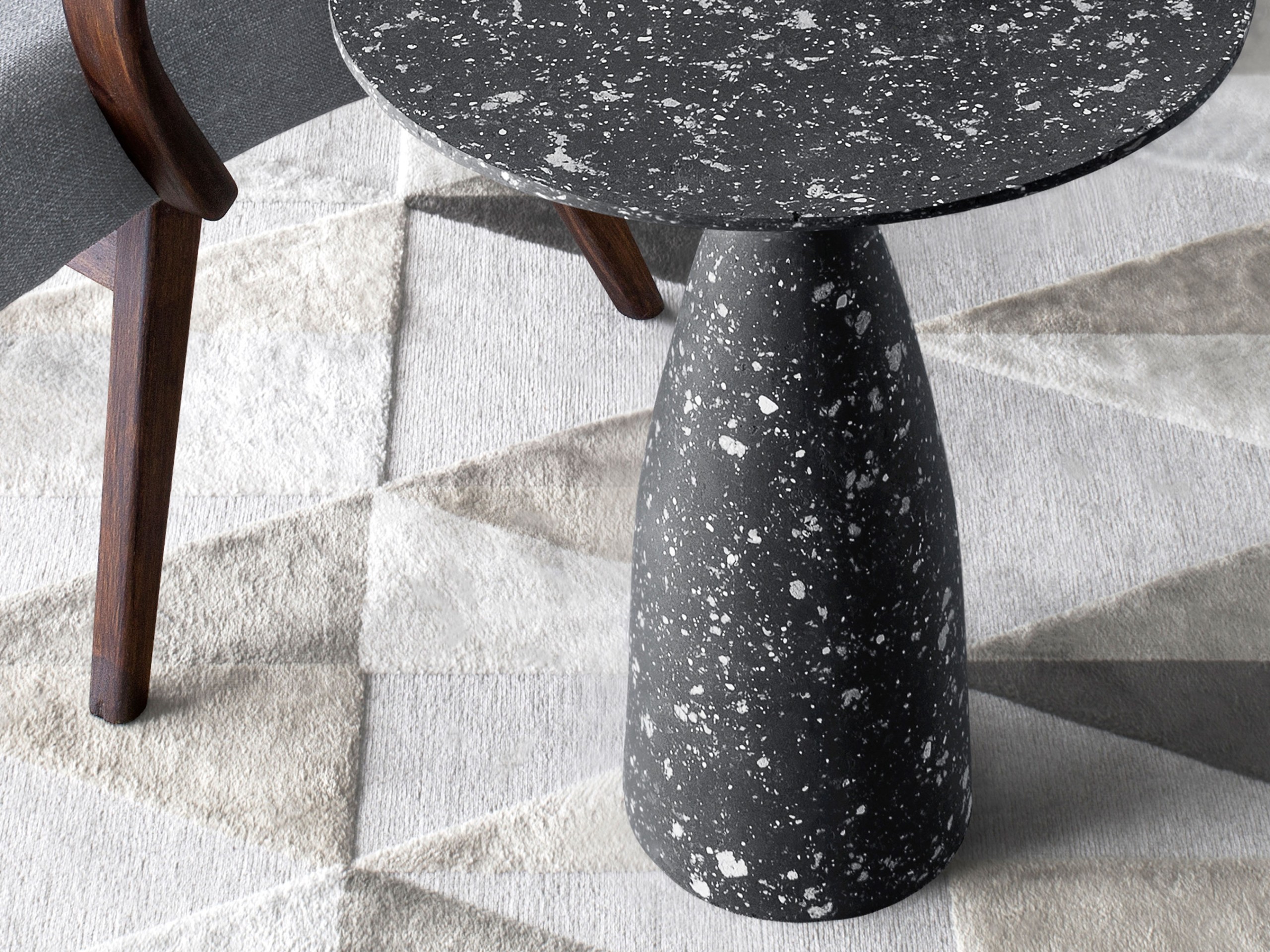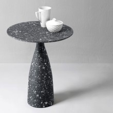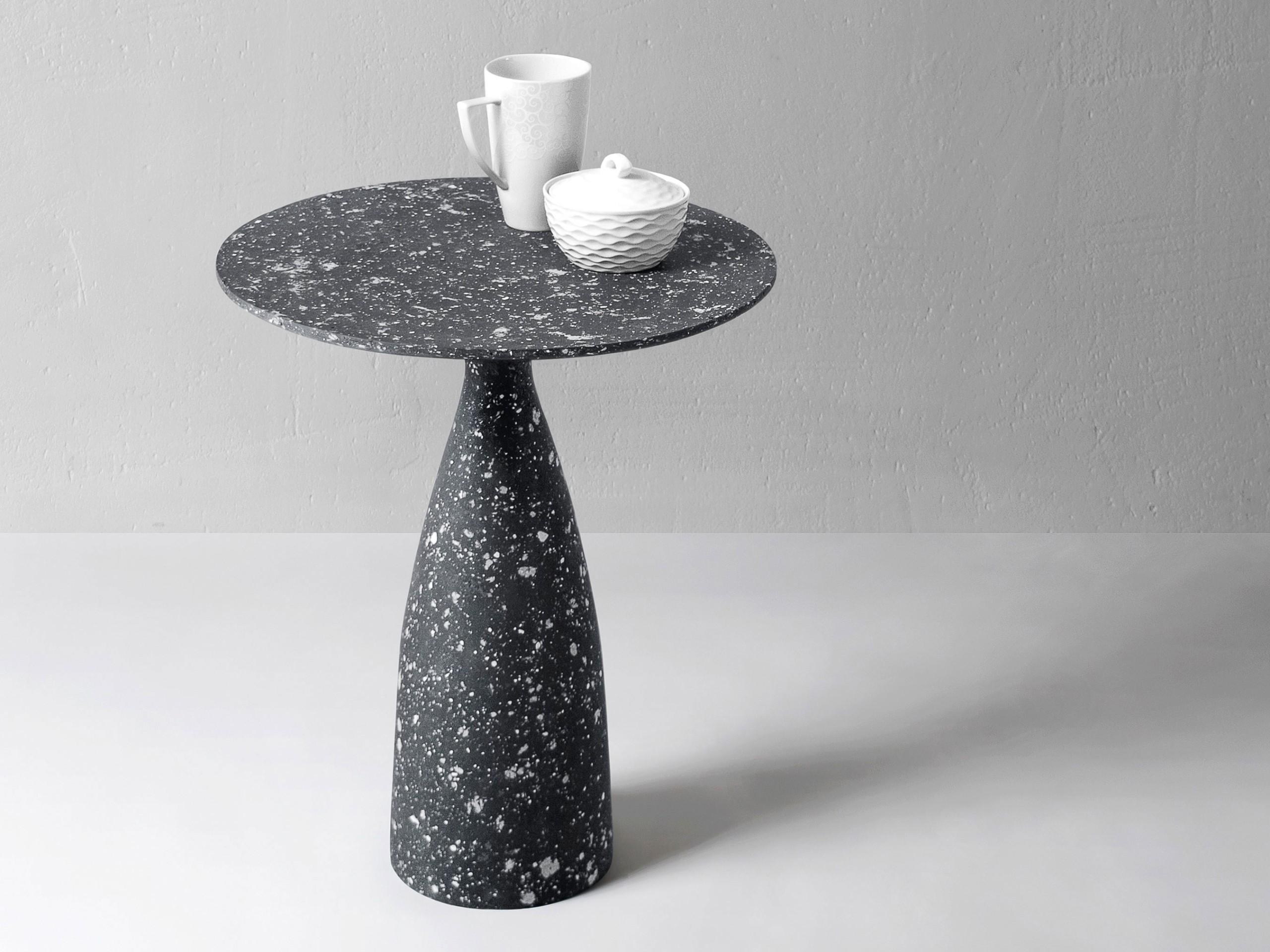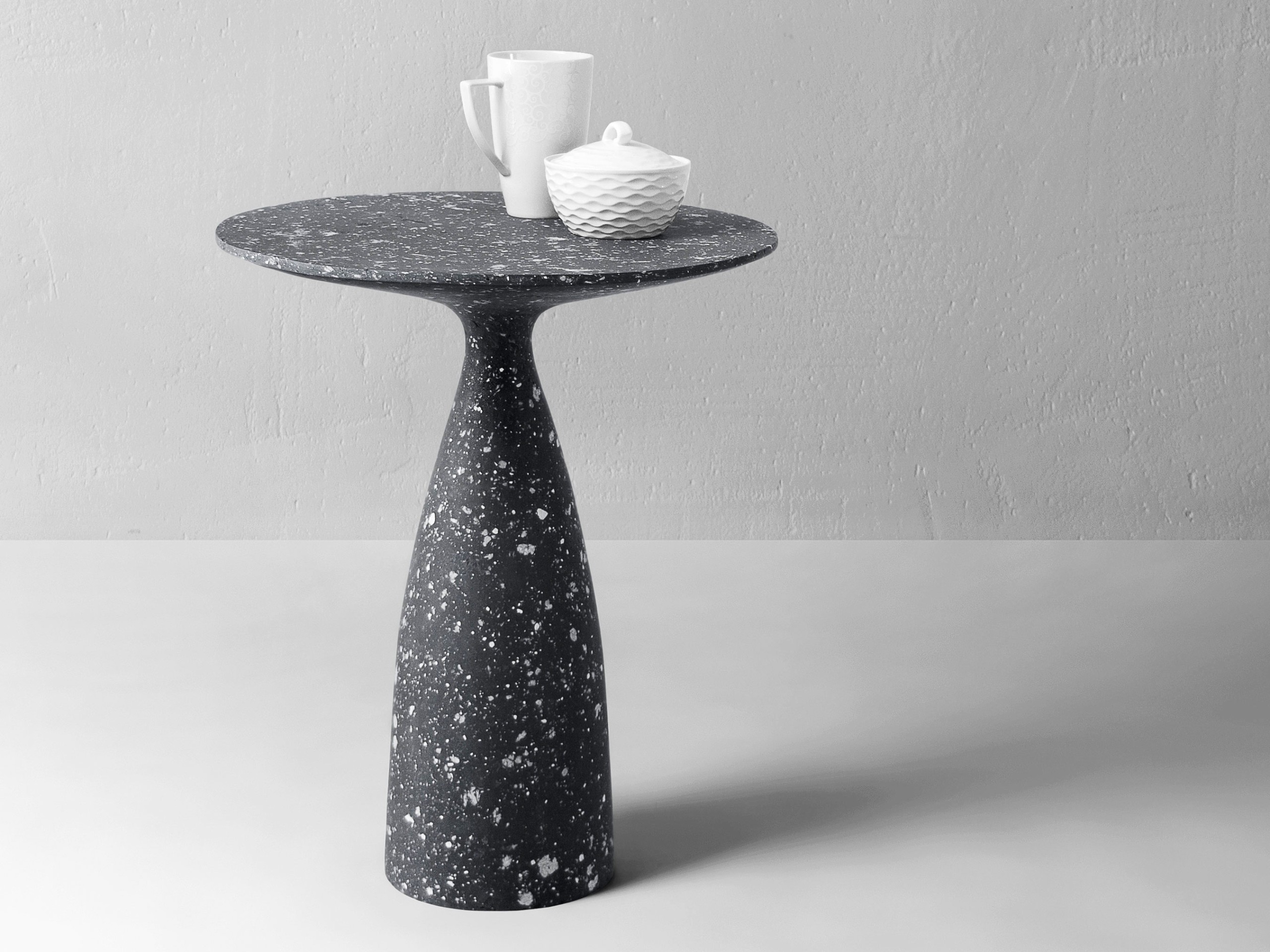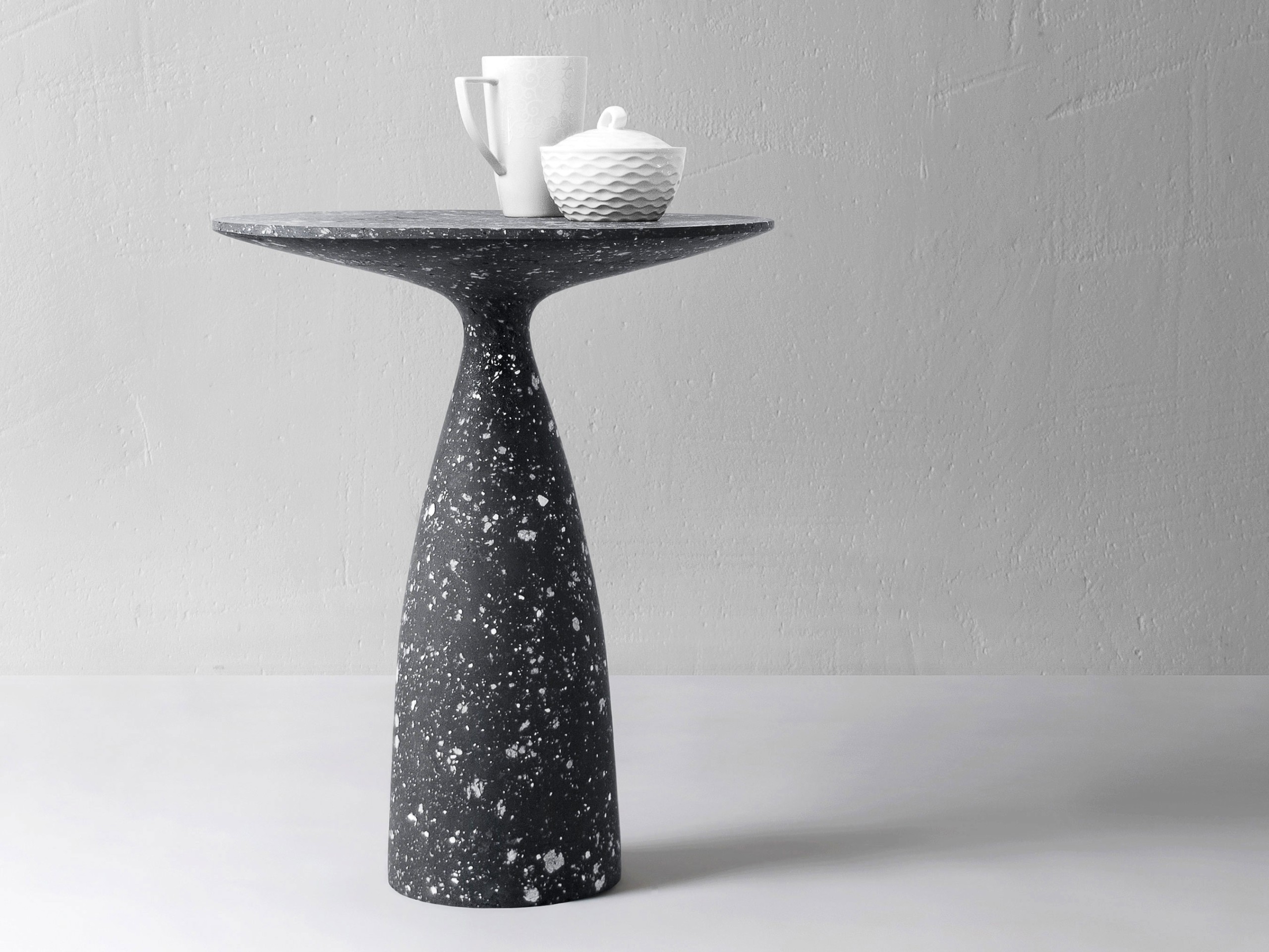 Massen som ligner betong er resultatet av ulike eksperimenter. Den er en blanding av flere komponenter, hvor den største delen er papirmasse. Selv om papir ofte assosieres med skjørhet, blir det like sterkt som tre når det blandes med andre materialer og tørkes. Det er også litt elastisk, slik at det ikke sprekker eller smuldrer. Det tok mye testing å finne riktig forhold mellom materialer for å skape en grov eller glatt overflate, vannbestandighet, stivhet og elastisitet. I produksjonen av disse bordene ble også resirkulerte materialer brukt. Som et resultat får disse møblene ikke bare et eksklusivt utseende og særpreg, men blir også bærekraftige elementer i hjemmet.